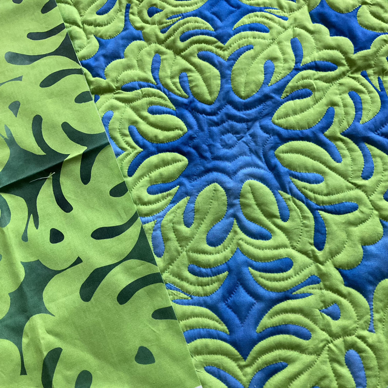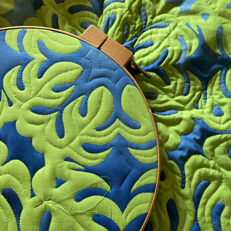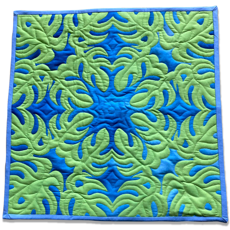 キルトはあまり得意ではありませんが、制作していく感じはそれなりに楽しい。リアルなハワイアンキルト風になりつつあるのが驚きです。そういえば以前こういった試みを考えた誰かがいたような気がしますが、パターン提供する人がいなくてどこかで計画が頓挫したのかもしれないなどと思いつつ、最後まで針を入れました。