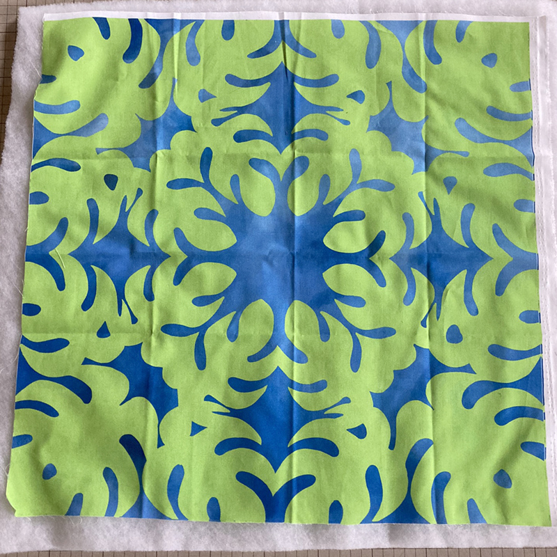 最初はこのような状態のもので、アップリケが済んだと思われるパターンが既にプリントされております。その布に綿と裏当て布を挟んでキルティングだけしたものが、果たしてハワイアンキルトに見えるかどうかの実験でございます。