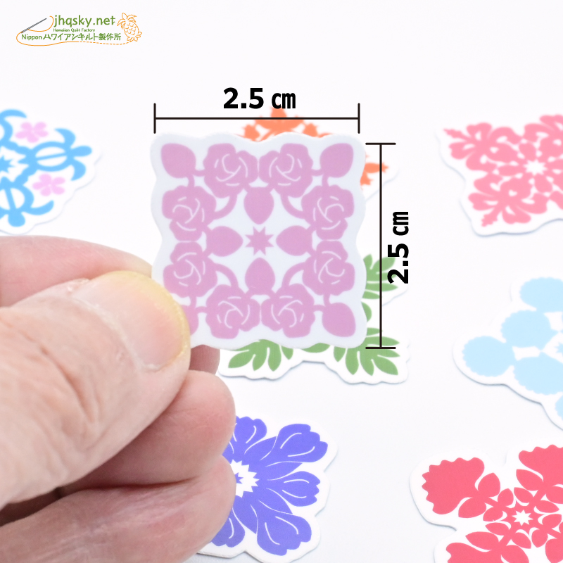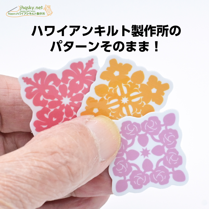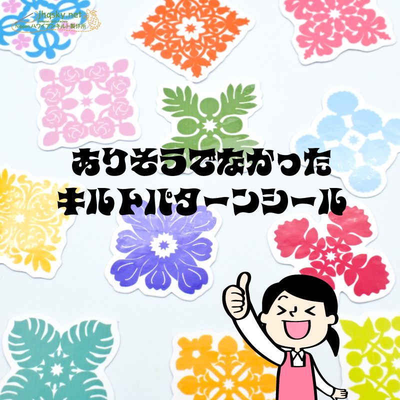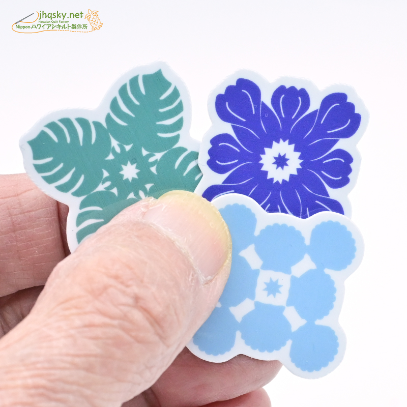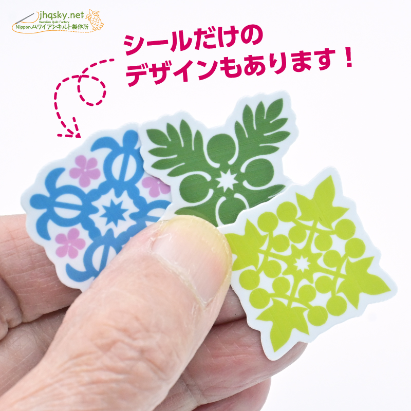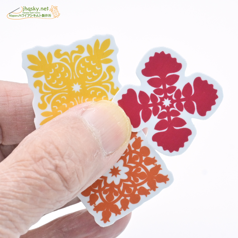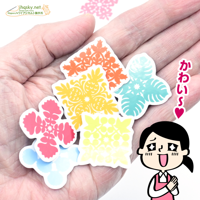 ハワイアンキルトのパターンは、わたくしにとってはサンリオやディズニーのキャラクターと同じ。最近人気が高いとされる「ボンボンドロップス」みたいな立体的プクプク感はございませんが、完璧なオリジナルシールとして結構かわいい姿になりました。ハワイアンキルトを手掛けておられる方なら、キルトパターンのシールなんて嬉しい! なんて思わないかな?